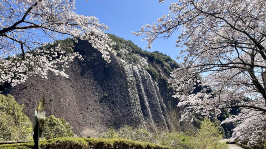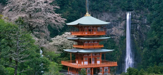 日本三大名瀑の一つ「那智の滝」は落差133mで直瀑日本一を誇り、那智山青岸渡寺三重塔と相まった壮大な風景に桜が彩りを添えます。