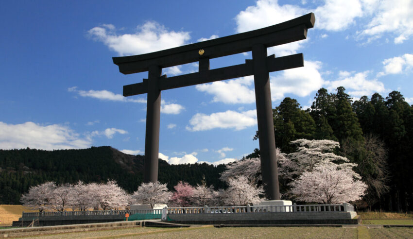 熊野本宮大社の旧社地。日本一の大きさを誇る大鳥居をはじめ、ソメイヨシノやシダレザクラによって、鮮やかな春の色に彩られます。