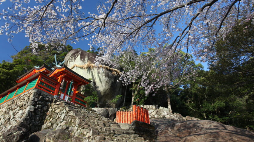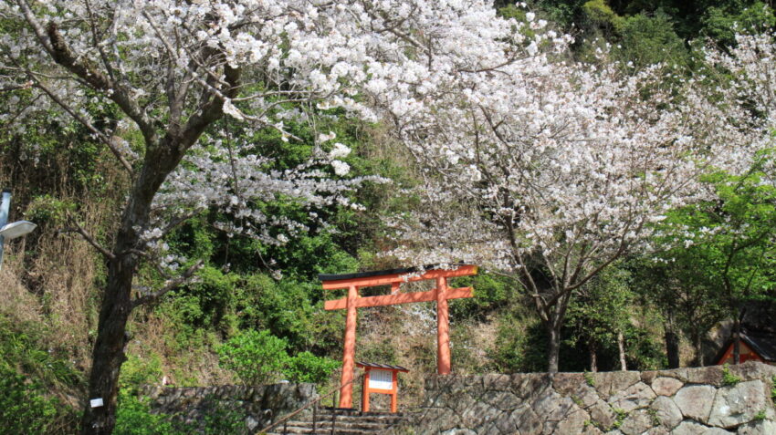 熊野速玉大社の末社であり、紫陽花の名所としても知られる渡御前社では、境内に桜が咲き誇り、赤い鳥居とのコントラストが映えます。