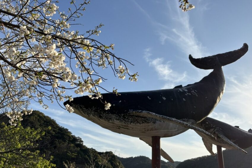 国道42号線から太地町へと入ったところに、実物大のザトウクジラの親子が出迎えてくれます。春には桜と鯨を撮影することができます。