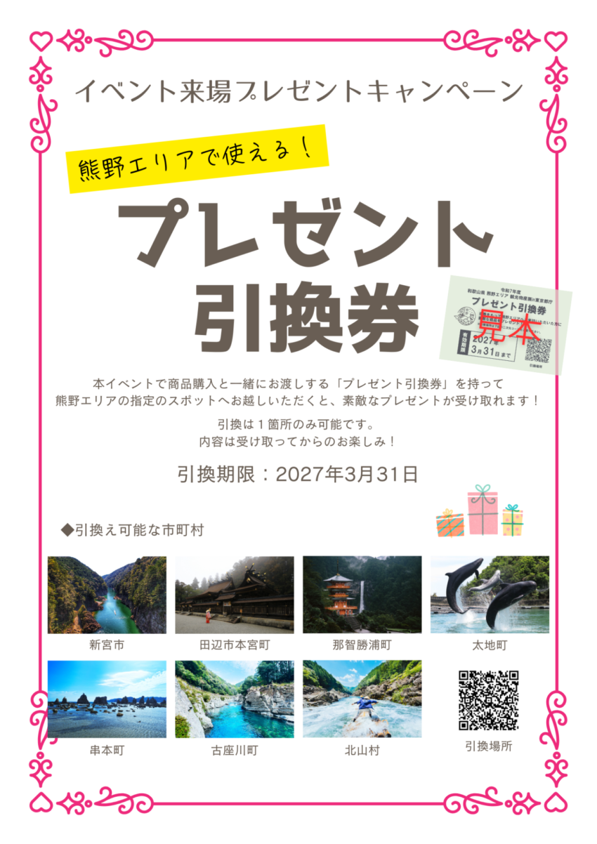 熊野エリア観光推進実行委員会の各出展において、「プレゼント引換券」を配布しております。