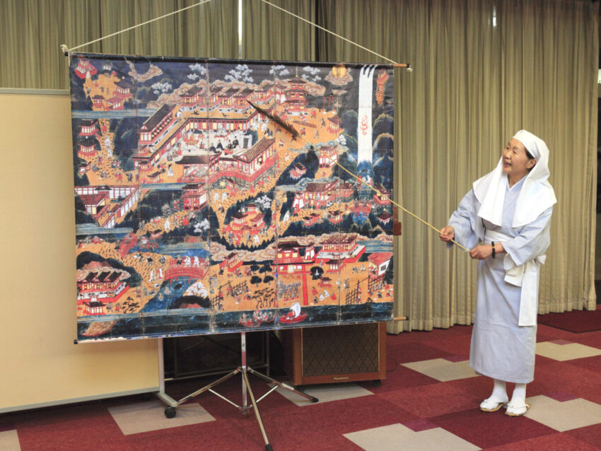 那智参詣曼荼羅という中世の熊野信仰の様子が描かれた絵図の絵解きを見ていただいた後に、古の熊野を想像しながら大門坂や熊野那智大社を巡っていただくことで、単に歩くのとは異なった魅力を感じられると思います。
