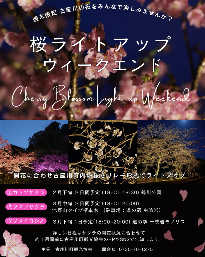 毎年イベント開催と開花時期が大きくずれ込むため今年は開花状況に合わせて、1週間を目安に古座川町観光協会HPやSNSにて詳細日時をお知らせします。。