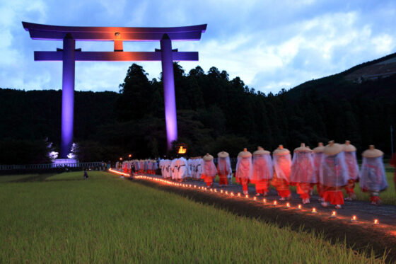 10/11に悪天により中止となったため、花火のみ延期開催されます。本来の八咫の火祭りは時代行列と御幸道や大斎原を彩る光、熊野八咫花火からなるお祭りです。