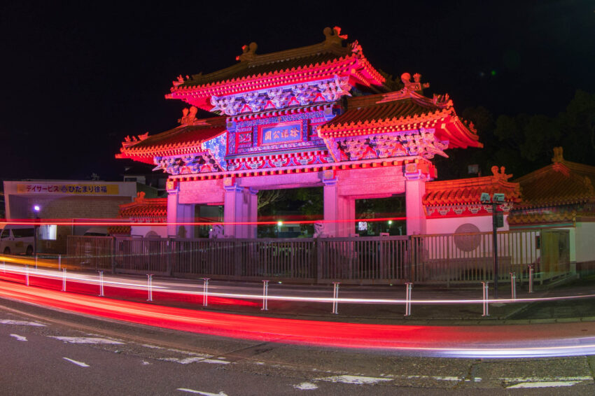 徐福公園のシンボルとして親しまれている重要文化財「桜門」が、色鮮やかにライトアップされ、幻想的な光景が浮かび上がります。
