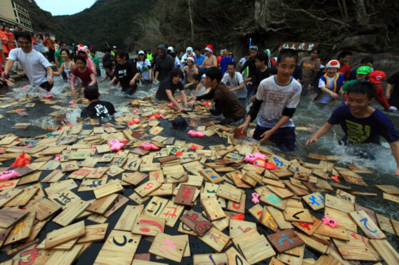 川湯温泉「仙人風呂」で行うかるた大会!巨大な露天風呂に浮かんだ杉板製のかるたを集め、その数を競います。(参加は要事前予約)