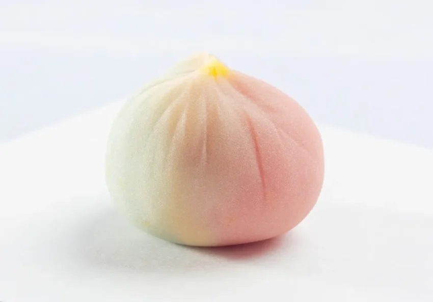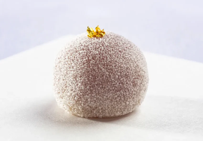 誰も踏み入れたことのない秘境の森には、神秘的な紅の果実が瑞々しくたわわに実る。まるで禁断の果実のような味わいは甘酸っぱく麗しい。そんな山桃と李の果実を白餡と合わせ、求肥餅の中にそっと包んだ。森の黒文字も遠くに薫る。普段あまり味わうことのできない野生の果実を思い出に残す。