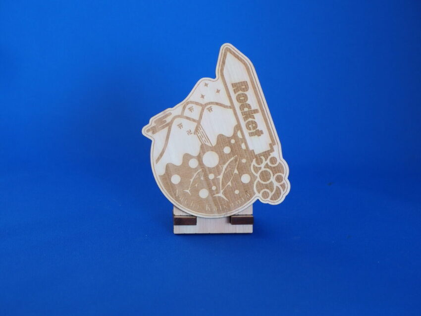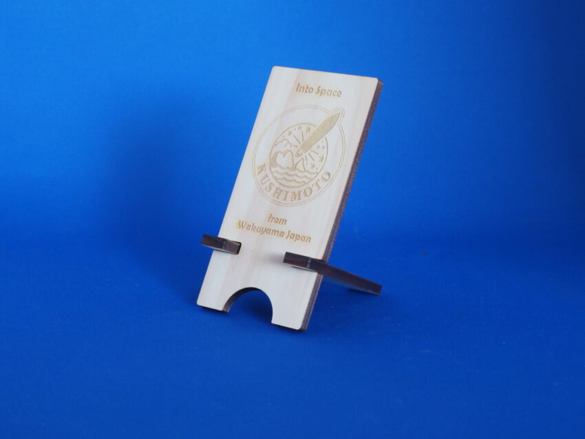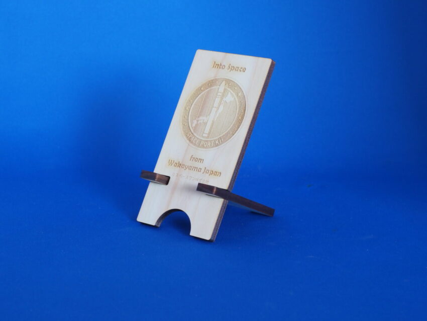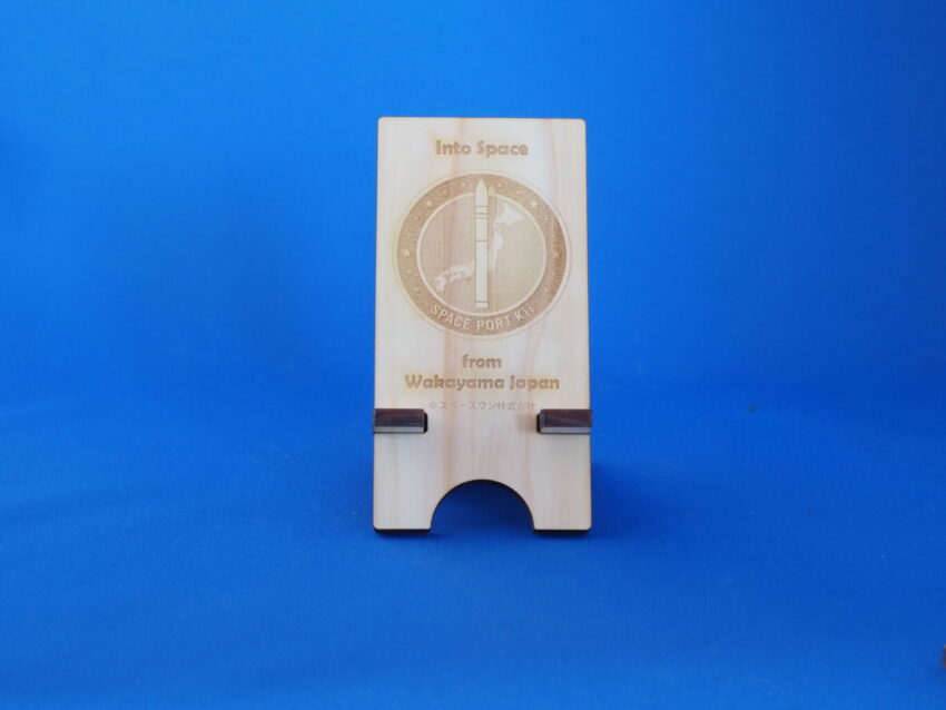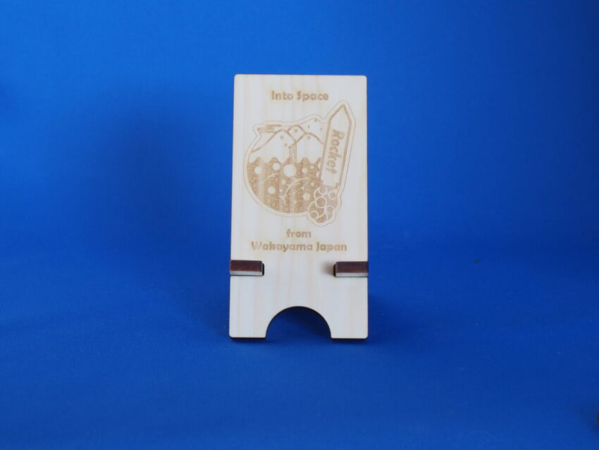 ロケットエンブレム等がプリントされたひのき使用のスマホスタンドです。