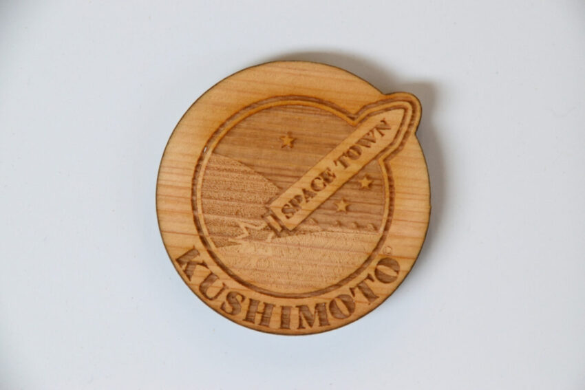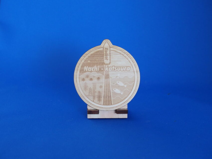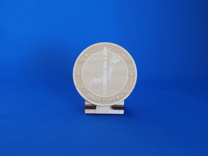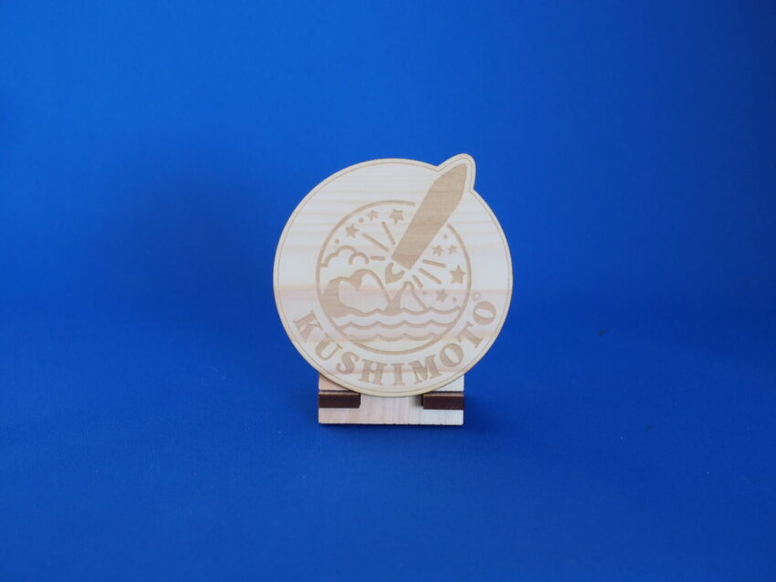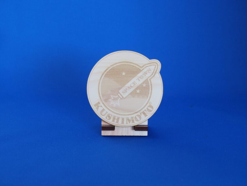ロケットエンブレム等がプリントされたひのき使用のコースター(スタンド付き)です。