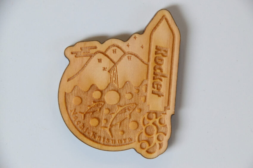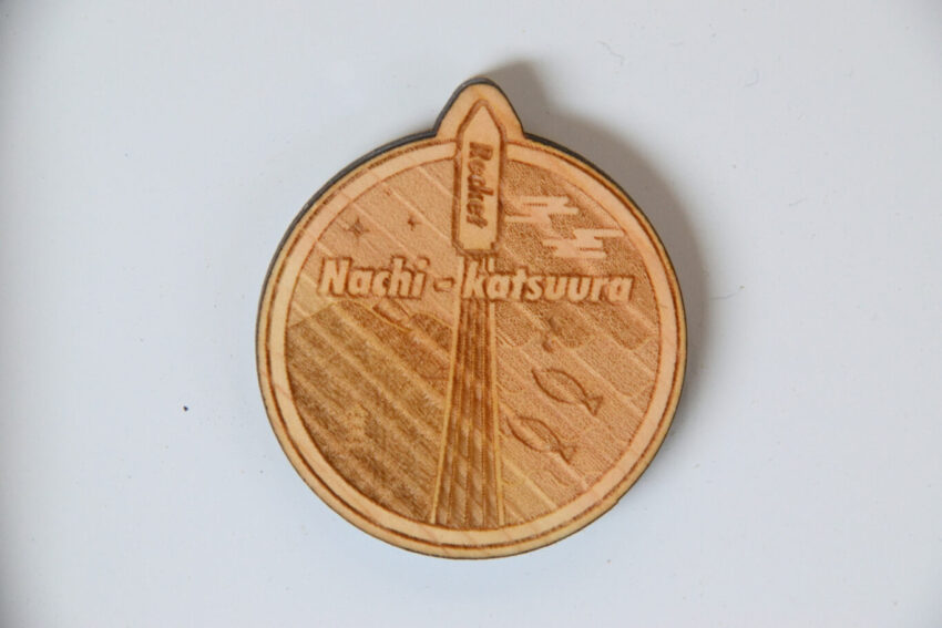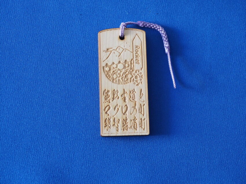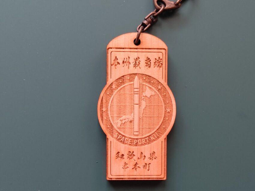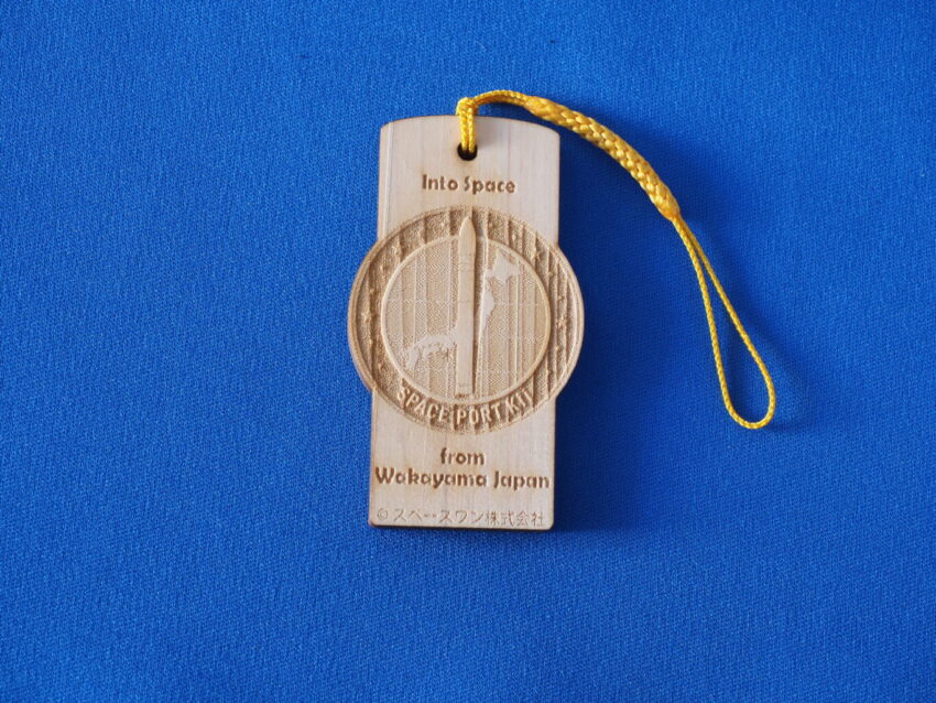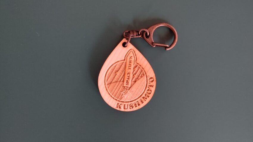 ロケットエンブレム等がプリントされたひのきキーホルダーです。