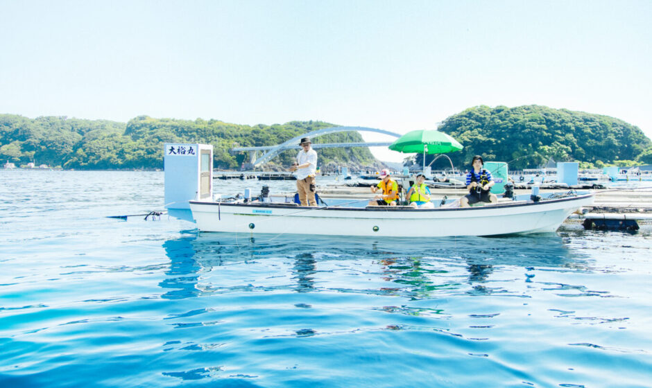 養殖イケスの横に、トイレ付きのボート(カセ船)をロープで固定して釣りをお楽しみいただく、串本湾特有の釣りです。