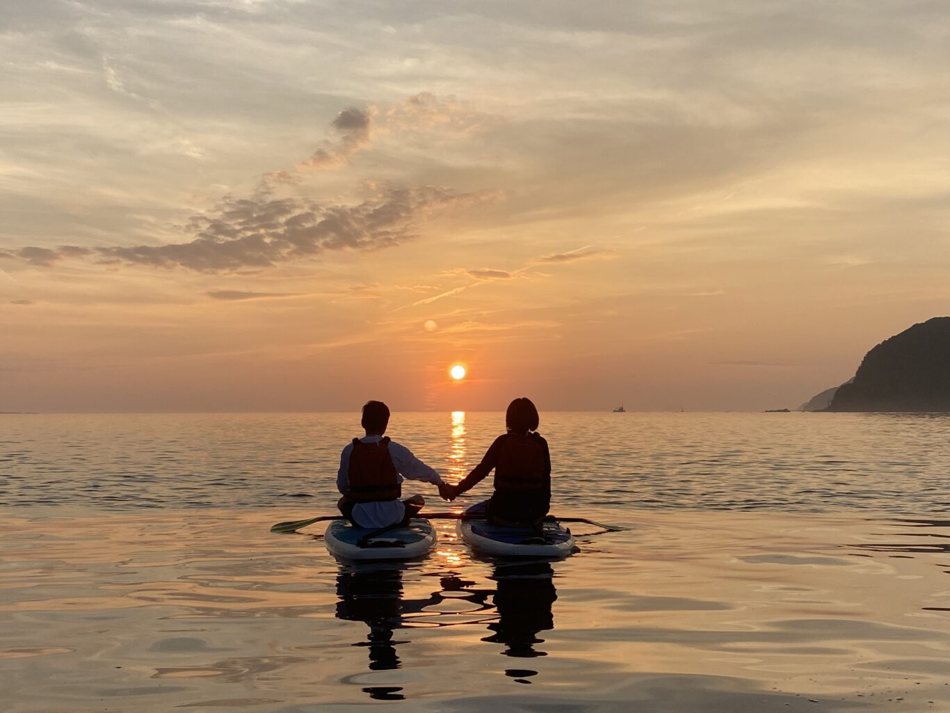 SUPに乗って早朝の海上に漕ぎ出し、朝焼けから日の出を拝みます。二度と同じ景色に会うことができない特別な体験です。