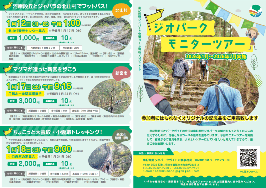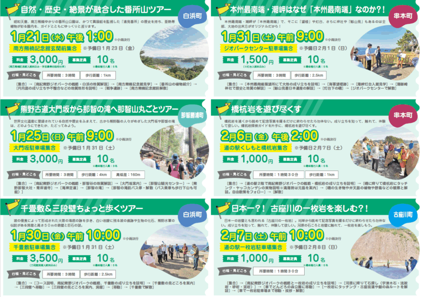南紀熊野ジオパークガイドの会では南紀熊野ジオパークの魅力をもっと多くの人にお伝えするために、定番となるコースの造成を進めています。今回モニターツアーを実施して、皆様からご意見を頂き、よりよいツアーにしていきたいと考えていますので、ぜひご参加ください!