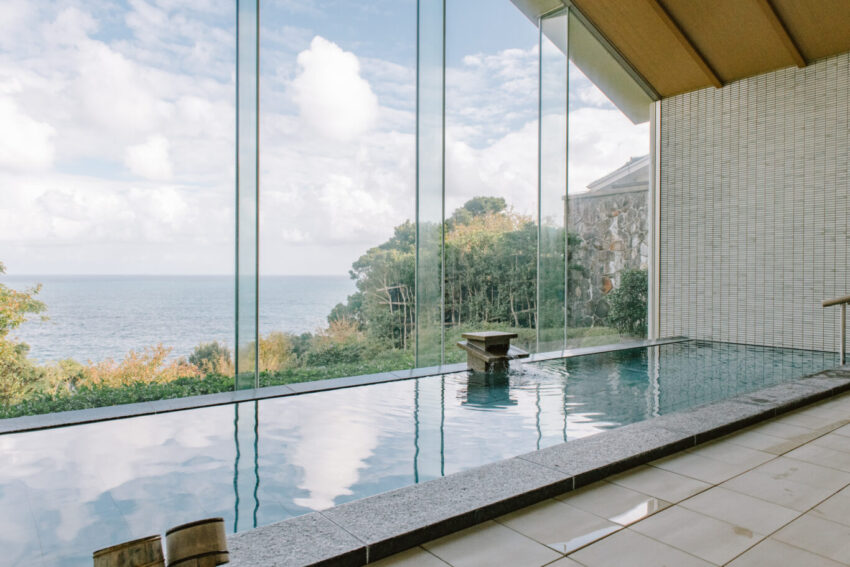 熊野灘を見下ろす高台に建つ宿泊施設。天気の良い日には露天風呂「めざめの湯」から朝陽を眺められます。