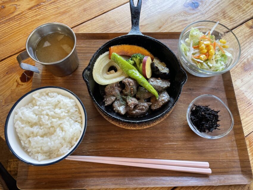 日本最大(高さ100m、幅500m)の一枚岩と清流古座川を眺めながらジビエ(鹿・猪)料理を中心としたメニューを召し上がれます。(もちろんからあげランチやナポリタンなどのメニューもございます。)